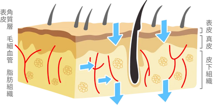 TDDS:Transdermal Drug Delivery Systemを用いることで皮膚表面の角質層を経て表皮中に送り込まれ、さらに真皮を透過して毛細血管より吸収されることで効果を発揮します。
